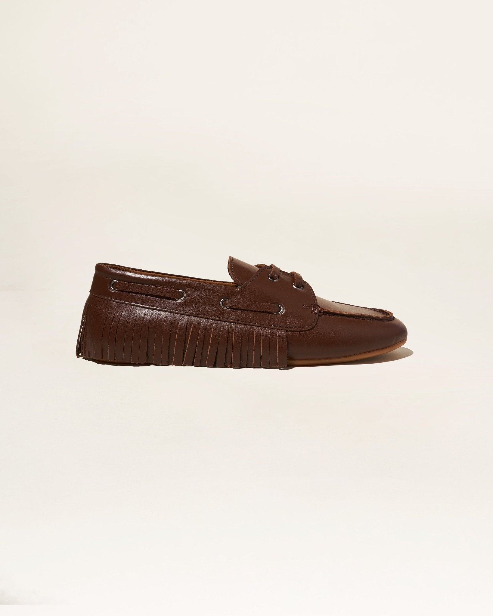 The side fringe and leather lace create a decorative detail that recalls the sporty heritage, while the rubber sole makes it perfect for every summer stroll, between docks and city.