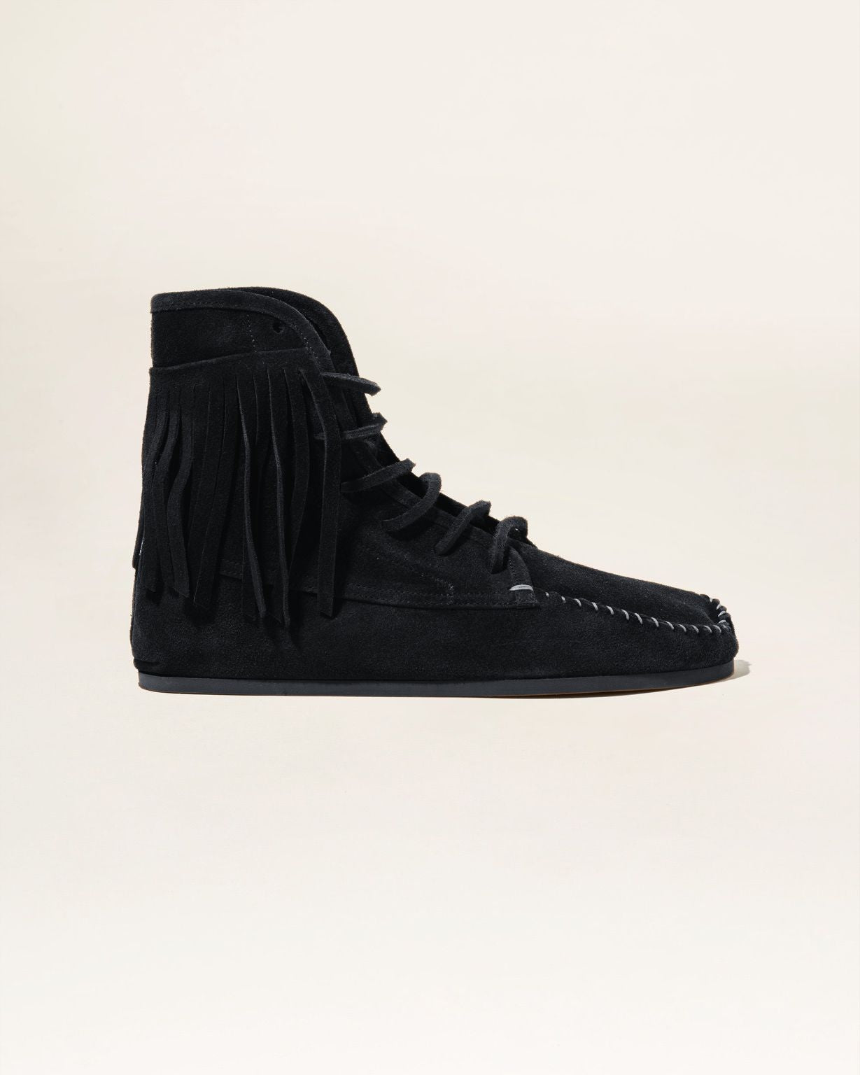 Incontra Jacqueline, lo stivaletto piatto che porta un tocco di stile bohémien al tuo stile quotidiano. Realizzato in morbida pelle scamosciata con frange giocose alla caviglia. I lacci in pelle regolabili ti permettono di personalizzare la vestibilità a tuo piacimento, rendendola tanto comoda quanto chic.