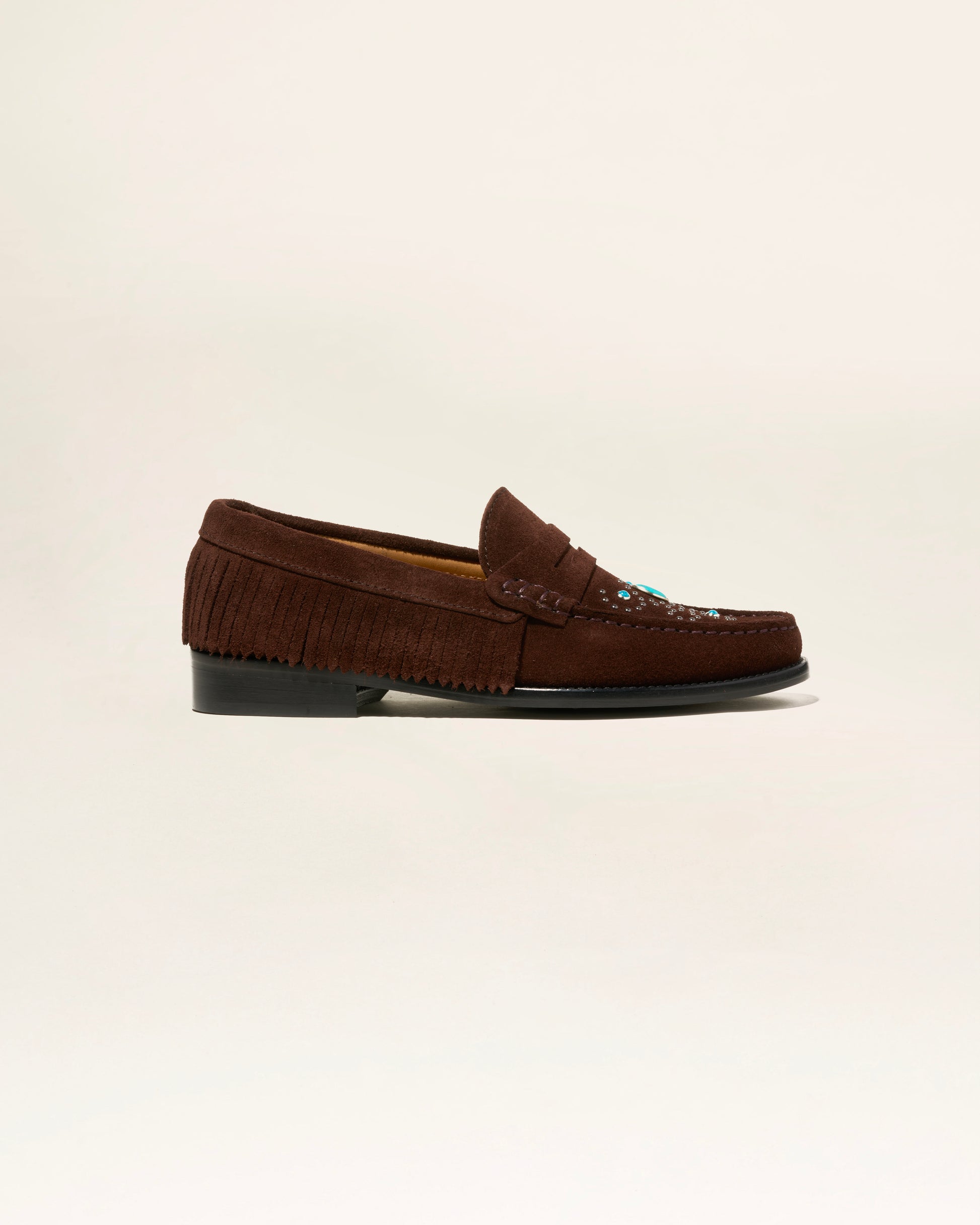 Scopri Sylvie, il mocassino che trasforma ogni passo in una dichiarazione di stile! Realizzato in morbidissima pelle scamosciata, questo capolavoro vanta affascinanti frange laterali che danzano con ogni movimento. La tomaia è impreziosita da borchie e turchesi autentici, che catturano la luce e aggiungono quel tocco bohemien che fa la differenza. La suola ibrida in cuoio e gomma antiscivolo garantisce comfort e stabilità, perfetta per chi non vuole compromessi tra eleganza e praticità. Che tu stia passeggiando in città o esplorando nuove avventure, Sylvie è la scelta ideale per chi ama osare con personalità.